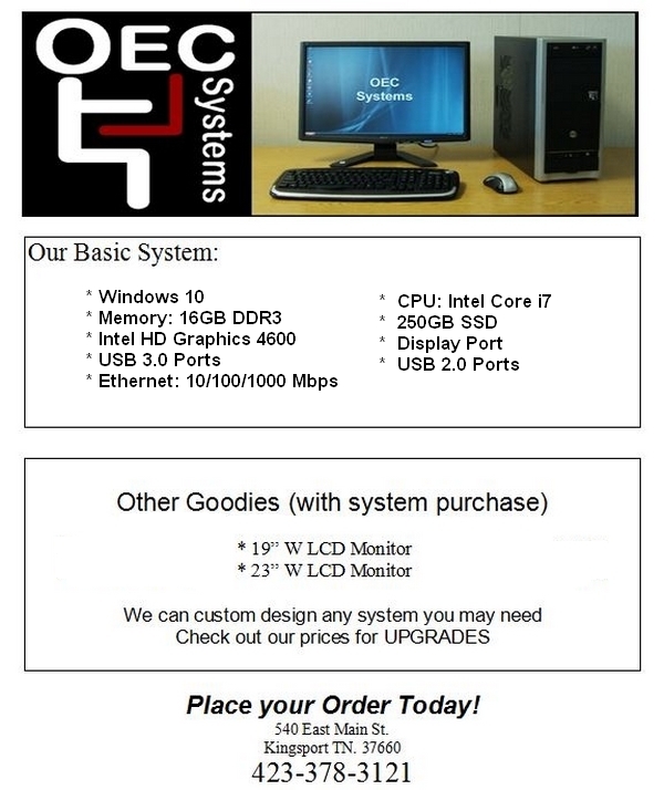 OEC builds each system to meet the demanding needs of our customers. Home systems with Internet capability, office workstations, network servers and Internet servers are all configured to the specifications of each client. Our computers are also designed to allow for expansion in the future. And if you are constantly on-the-go, we offer a full line of notebooks as well.